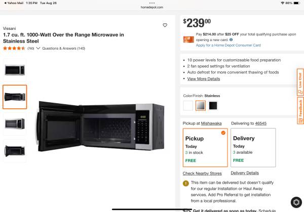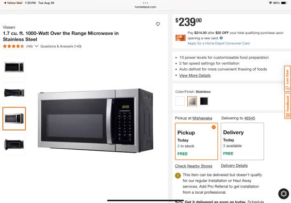 Prepare a wide variety of foods in the Vissani 1.7 cu. ft. over the range microwave in stainless steel. Quickly boil, re-heat and defrost food with the 1,000-Watt of cooking power and 10 cooking levels. 6-pre-programmed auto-cook menus help you cook favorite foods quickly, while the auto defrost sets the correct power level automatically. The 1.7 cu. ft. capacity provides ample space for dinner plates and small casserole dishes.