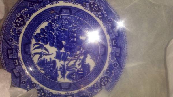 2 plates and bowl with blue set, white and green crystal glass, and the smaller desert china plates