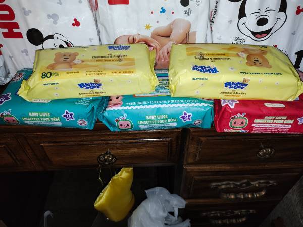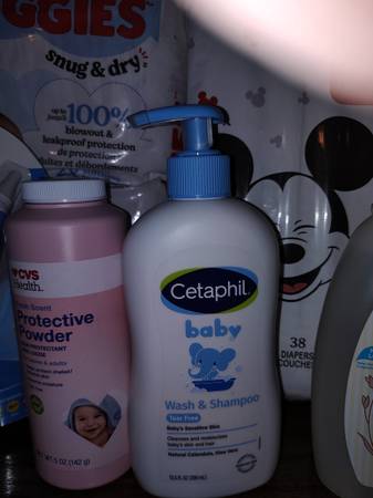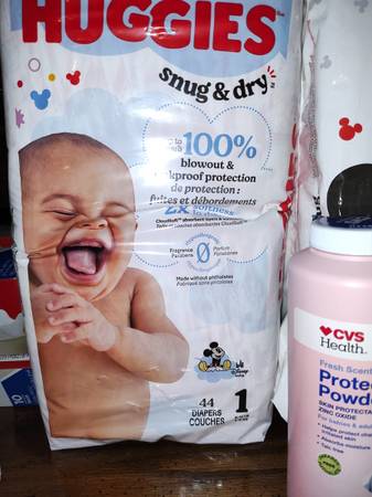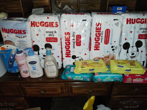 Have 5 bags of Huggies diapers size 1, 5 packages of wipes, 2 bottles of baby soap/shampoo, one baby powder to prevent rashes, one ear thermometer all brand new $40