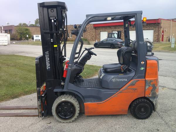 4 Tier 5000 LB. Capacity Toyota Forklift, Model # 8FGCU25, propane gas, new traction tires, 2905 hrs., no leaks or issues, very well maintained, 4 tier mast, lifts 21'-6" high, side shift, 42" forks, lbr., lights, strobe light, back up alarm, digital display, premium seat, fan, front & rear blue safety spotlights, ideal model for warehouse with tall racks, we can offer delivery, propane tank is extra, come take a test drive at the warehouse, asking $12,915., contact is Tim.
