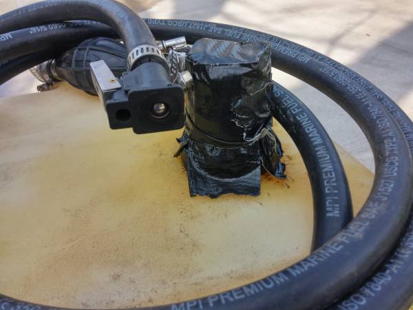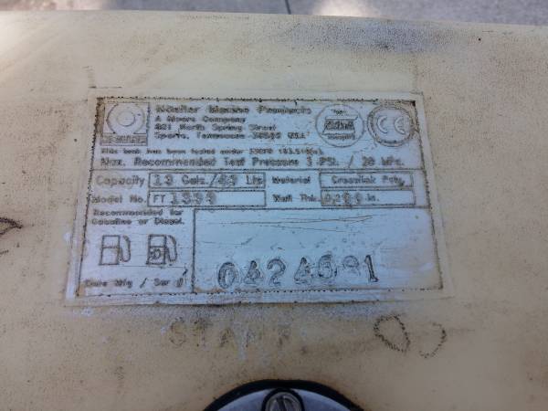 Used Moeller 13 Gallon Fuel Tank for below decks installation. Polyethylene tank was removed from a sailboat and had been used for gasoline. It has a fuel supply line for an outboard motor attached. The tank is a little dirty on the outside, but that's because the poly is impossible to clean. The tank works perfectly. Dimensions: 32" L x 10.25"W x 10.25"H