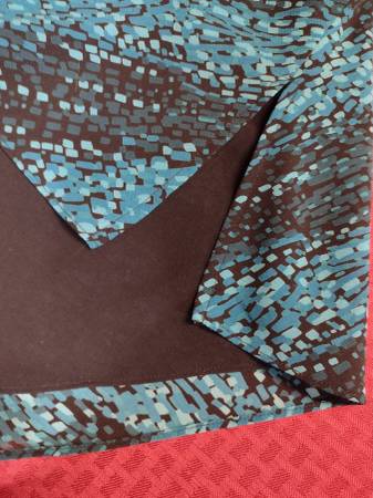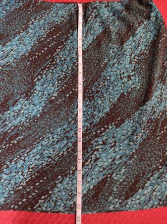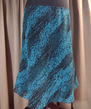 Elastic waist with a 6-inch slit on each side, knee length skirt. Solid black polyester lining allows the polyester shell to flow free. The shell is a black and turquoise pattern throughout the skirt.