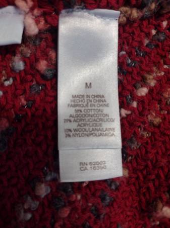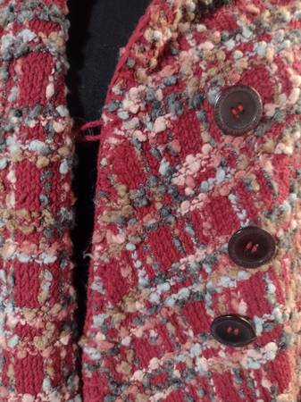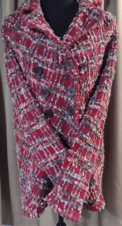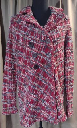 This sweater is soft and cozy, with a comfortable casual look. The primary base color is red, with light pink, dark pink, gray, brown, light blue, and some hints of green woven with a loose knit with textured bubbles/knots and a diamond pattern throughout the whole sweater. This is a longer and fitted cardigan and a women’s size medium. There are 6 buttons (3 are for decoration/3 are for fastening) on the front with one button on the inside.
