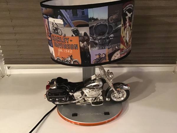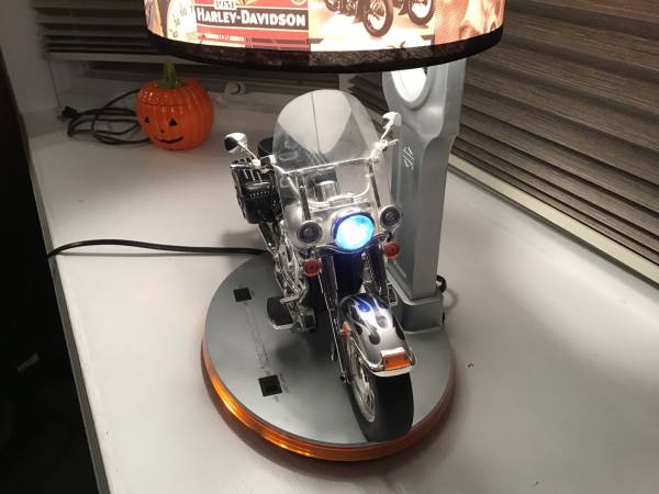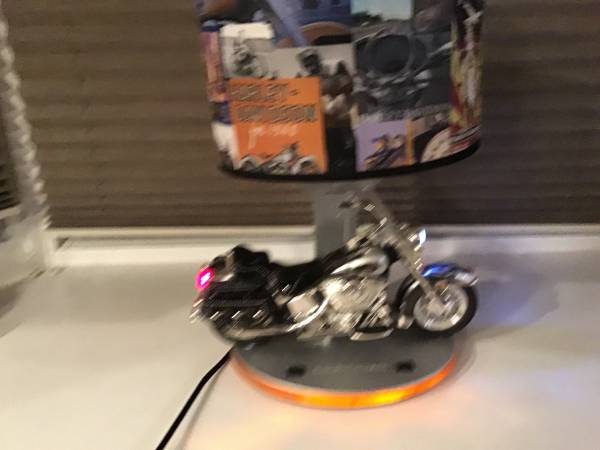 Very unique motorcycle table light. Has regular light bulb and a nightlight function with the head light and tail light and base on. What really the neatest is sound of the Harley starting and running. Pictures do not do it justice. The lamp shade alone is very impressive and sort after.