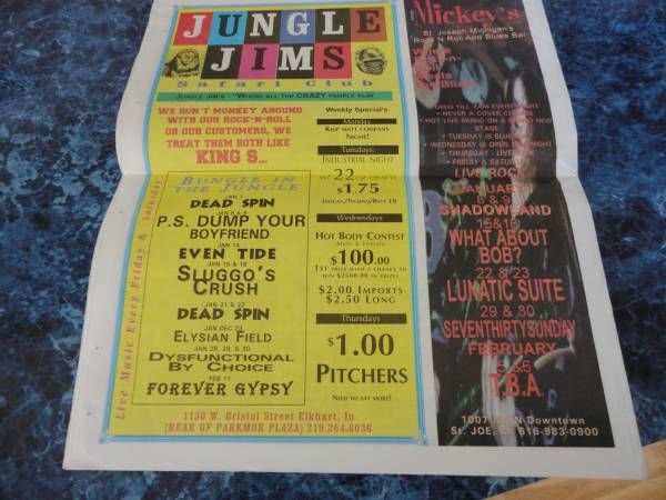 A highly interesting local entertainment newspaper from January 1999, in excellent condition. Fifteen pages of scintillating news of the local music scene - clubs, bands, record stores, current music charts, jam sessions, music equipment and more. All this can be yours by replying to this ad with your phone number so that we can set up an appointment. No texts please. Cash and carry. You pick up. Thanks for looking!