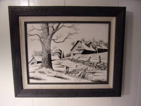 Black and white winter farm scene print on canvas, measures 17 1/2" x 21 1/2", price $50
