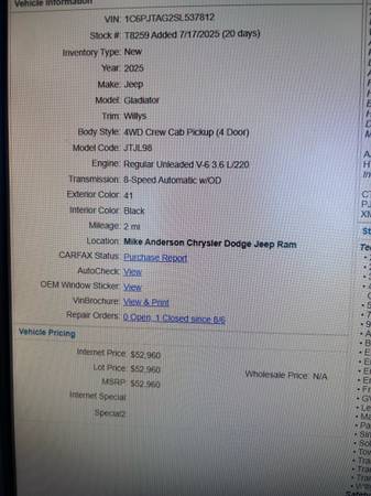 2025 Jeep Gladiator Willys 4WD Crew Cab Regular Unleaded V6 3.6L Color 41/black Laurie Birchmeier Sales Rep Mike Anderson CDJR Rochester ext 44 or call my cell Stock# T8259