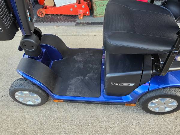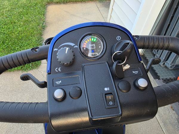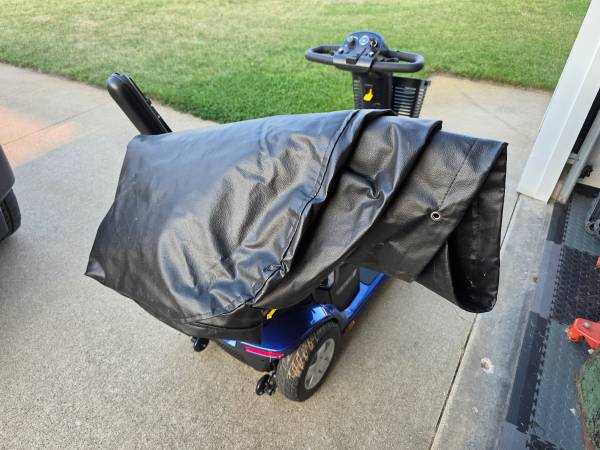 Viper Blue 4 wheel Pride Scooter with charging cable and heavy cover.