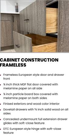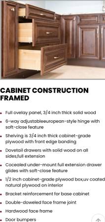 Affordable kitchen cabinets semi custom made , 3/4 inch solid wood , 6-way adjustable european style hinge with soft close feature. Shelving is 3/4 inch thick cabinet grade plywood with front edge banding. Dovetail drawers with solid wood on all sides full extension. Cocealed under mount full extension drawer glides with soft close feature. 1/2 inch cabinet grade plywood box uv coated natural plywood on interior. Braket reinforcement for base cabinet. Double doweled face frame joint. Hardwood face frame. Door bumpers. If you have any questions / concerns please dont hesitate to contact or email me. Thank you.