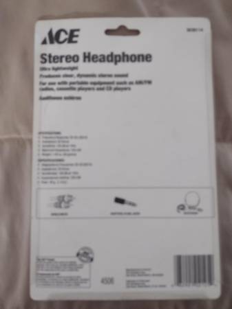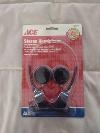 Ace Stereo Headphones - NEW $3 New in package, never used. Ace stereo headphones, model #3038114 Ultra lightweight Produces clear, dynamic stereo sound For use with portable equipment such as AM/FM...
