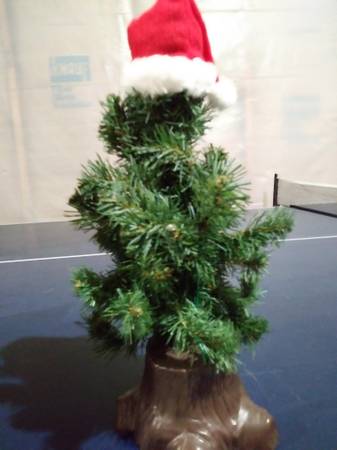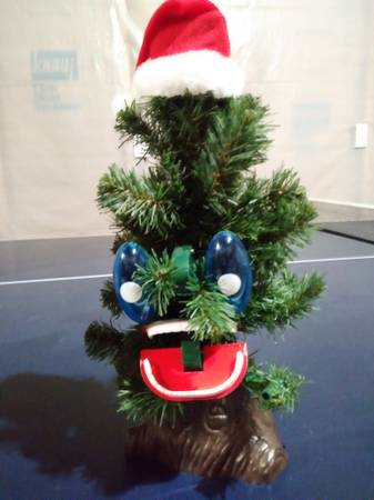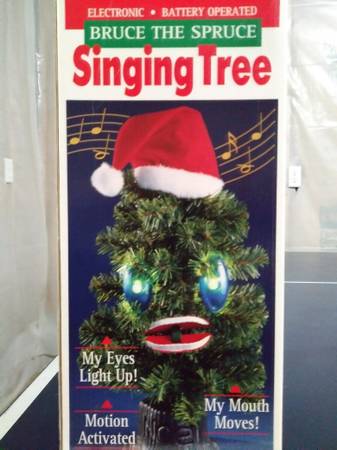 Sings Jingle Bells, mouth moves, eyes light up, motion activated, 14” tall, three “AA” batteries required, works, original box included