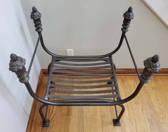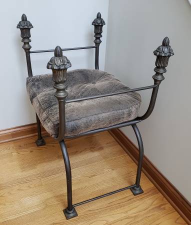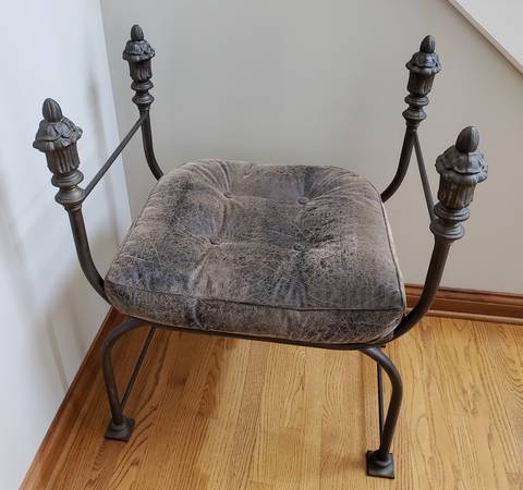 Unique Savonarola style iron chair with 4 ornate finials. Has some weight to it. Very comfortable! Includes a nice thick cushion from Pier 1. Cost of cushion alone was $40. Like new condition. From...