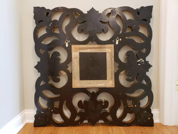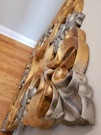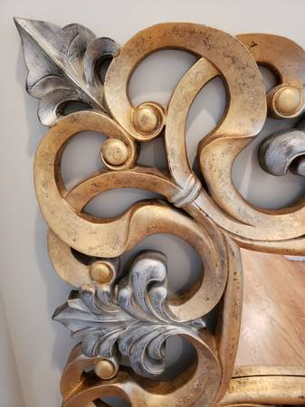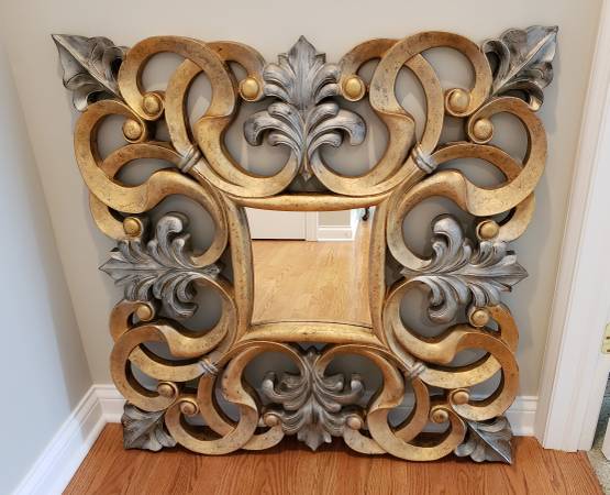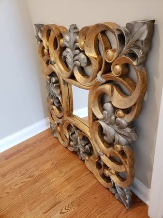 Mirror with a large matte gold and matte silver decorative frame. Frame is a resin-like material. Two D-rings on back for hanging. Like new condition. From a clean smoke-free home. Paid over $100...