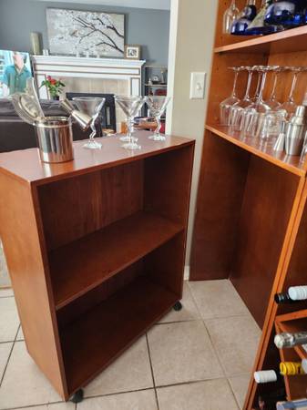 Shelf bar is very sturdy and is solid wood. The lower part of the shelf slides out and has wheels for extra storage.
