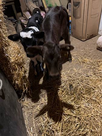 These calves weigh approximately 75-85#. All healthy, good poop(no scours) first round of shots. All eat 2 bottles a day with grain water and hay available 24/7. Located in Niles,MI. Cash only on pick up.