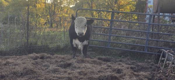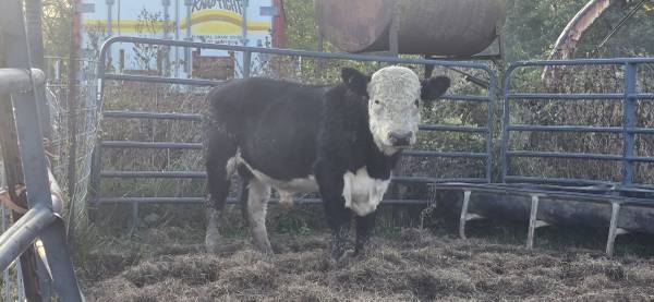 Herfed bull cross colour black and white. With a black eye patch roughly is about 800lbs
