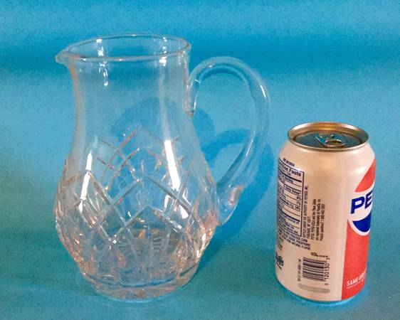Cut glass pitcher. Underside / bottom has design Clear. Was very expensive. Perfect condition. Beautiful. Downsizing, otherwise would not sell. About 8" tall. Non smoking, no pet home. CALL or TEXT...