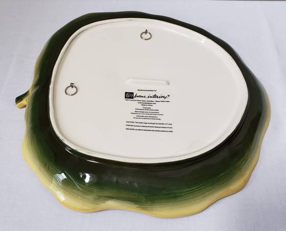 Palm leaf shaped ceramic dish that my be used for decoration or for serving food (food safe, as printed on the bottom). It has two rings on the back so it may be hung vertically or horizontally.