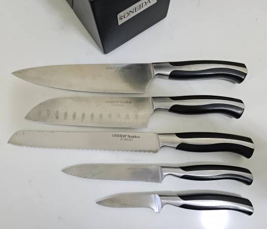 Solid wood knife block with 11 Oneida stainless steel knives, including: 1 - 8" Chef Knife 1 - 8" Bread Knife 1 - 7" Santoku Knife 1 - 5" Utility Knife 1 - 3" Paring Knife 6 - Steak Knives Slot for...