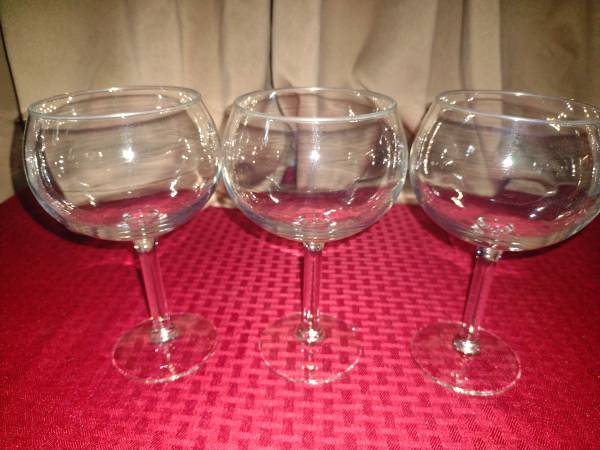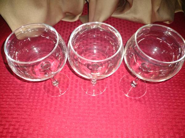 These three glass wine glasses have been gently used. We’ve sold the summer cottage, so they need to find a new home.
