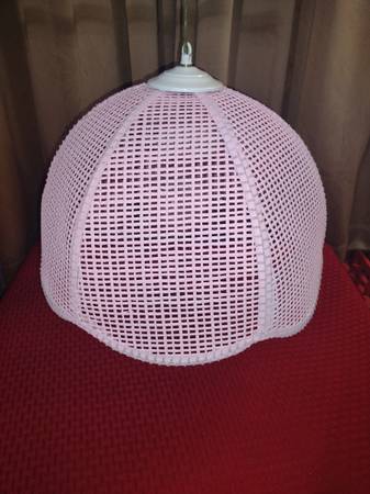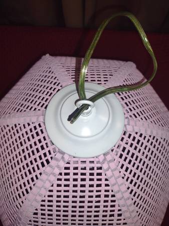 Its vintage woven wicker is a classic style. Painted a soft pink color. The lamp does need to be rewired and the wicker shade does have a few areas that have minor damage. The globe, which fits around the light bulb is missing, but is an easy find at a big box hardware store.
