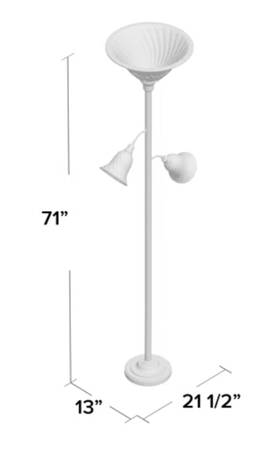 It's a 71" high floor lamp made of iron, glass and plastic. It has one main switch that controls 3 modes. The main light on top can fit 100 W maximum. The 2 lower reading light can fit 60W maximum each. (last 2 pics are from the product page.)