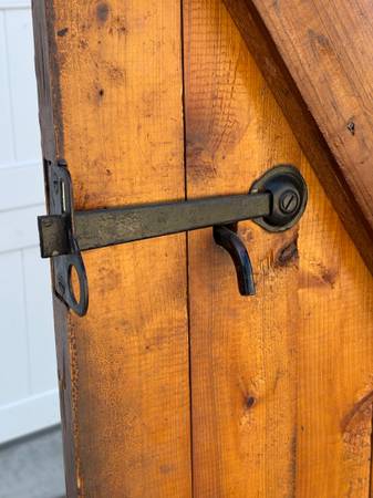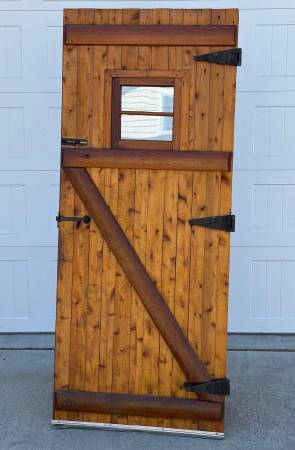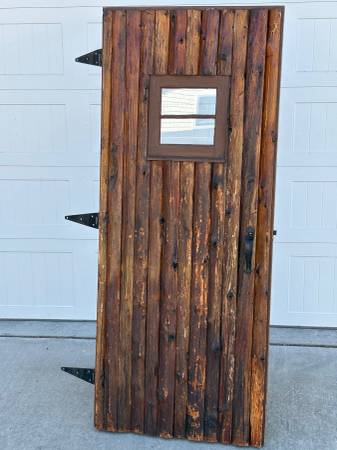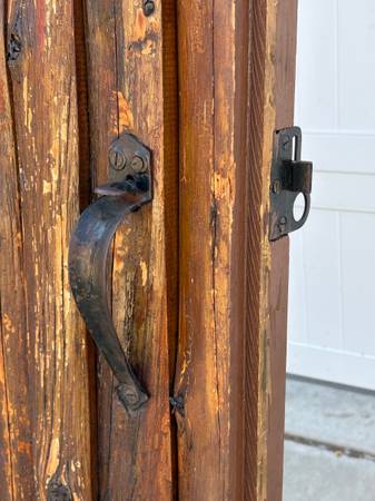 Vintage, all original, 1940's knotty pine door from kit cabin. Live edge exterior and milled interior. Single window. Original varnish in and out. Original latches and hinges. Very sturdy.