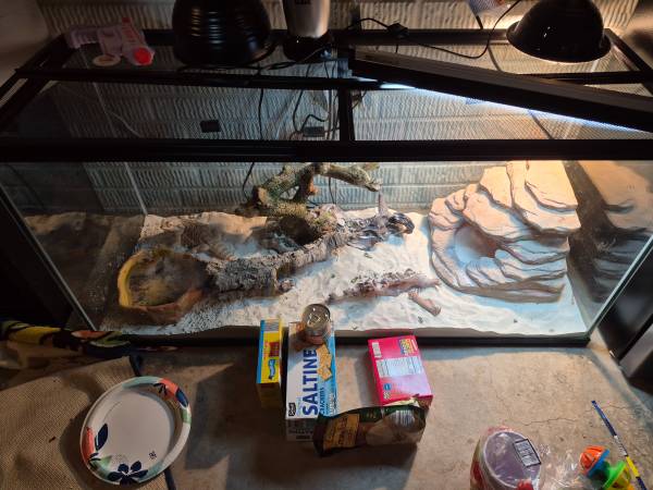 Comes with 75 gal tank and everything in it, calcium to put on crickets or veggies asking 100 obo
