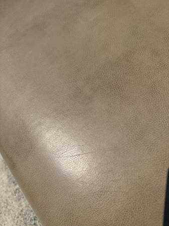 Condition: Item is used in great condition. Tan Ultraleather with light stitching and nickel nail head trim (has some rusting). Fold and tumbles into a bed. Various cradking as pictured. May need some nuts, screws or bolts and assembly to be complete.