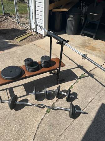 250 lbs of weight all bars and bench. Pick up Bristol I also have an Olympic weight set with about over 300 pounds of weights that I’m asking 325 for if you’re interested I can send pictures.