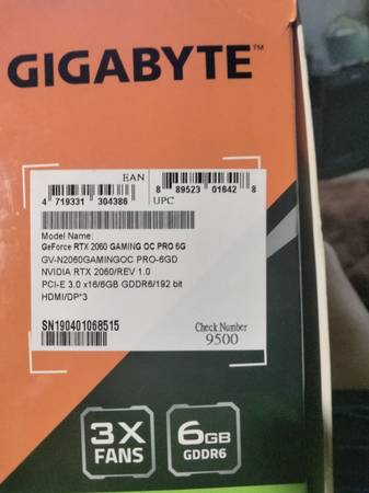 GeForce RTX 2060 Gaming Pro, video card OC 6g. Used in a gaming computer by an older couple. Text 574 -514-44zero 5