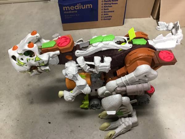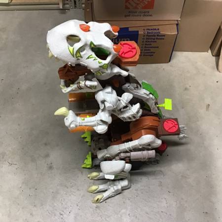 All working. Installed new batteries. Comes. With 3 figures. All lights works. Growls and walks. And stands up. Great action toy.