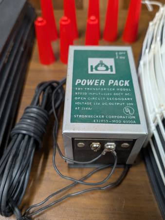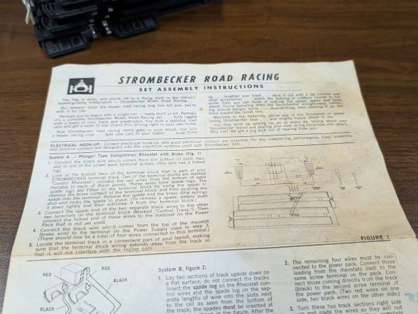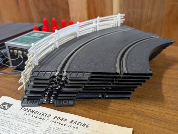 Strombecker 1/32 Slot Car Figure 8 Road Racing Track Set. Power pack, 2 controllers, 6 straight sections, 8 curves with guard rails and 8 lift supports. Instructions included. The power pack is working, tested with a multimeter. No cars included.