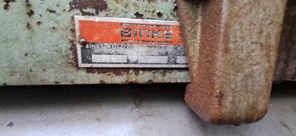 Binks air compressor used in a body shop for years works good except will need a rebuild. The valves do leaked some so it does loose pressure after setting awhile. The automotive air cleaner works great and reduces sound quite a bit. The 5 hp electric motor on it now is NOT included.